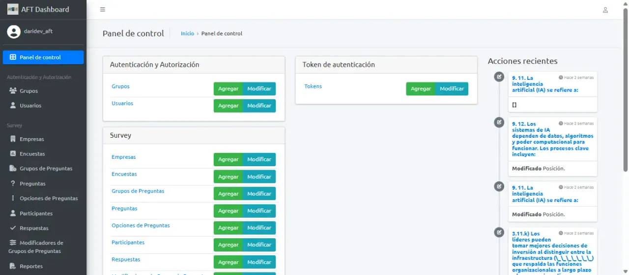 El proyecto AFT ofrece a las empresas una herramienta práctica y efectiva para evaluar competencias tecnológicas y tomar decisiones basadas en datos. El módulo de reportes en PDF convierte evaluaciones en informes claros, profesionales y listos para usar, lo que facilita la interpretación de resultados por parte de directivos, responsables de recursos humanos y formadores. Con esta solución, las organizaciones pueden detectar áreas de mejora, planificar estrategias de capacitación y potenciar el talento interno, avanzando hacia una gestión de recursos humanos más moderna y orientada al futuro.